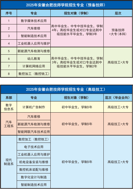 应往届高中/中职结业生:需供给结业证书,年满18周岁,可报考高级工班(学制3年)或准备技师班(学制4年)。身体取操行要求:无传染性疾病、色盲色弱(数控、工业机械人等专业要求无色盲色弱),无纹身、病史及不良嗜好。学院专业系统笼盖智能制制、数字经济、现代办事三大范畴,构成八大特色专业群,2026年新增“智能制制手艺使用”“智能网联汽车手艺使用”等前沿专业,具体如下:工业机械人使用取:取西门子合做,培育从动化产线调试、机械人编程人才,结业生进入格力、江淮汽车等企业,月薪8000元起。数控加工(智能编程标的目的):取合肥长鑫存储、美的集团合做,开设五轴联动加工、3D打印手艺课程,处置细密制制岗亭。新能源汽车检测取维修:结业生可进入比亚迪合肥,处置电池检测、电机维修等手艺岗亭,月薪6000-8000元。智能网联汽车手艺使用:培育车载传感器调试、智能交通系统运维人才,对接安徽省“十四五”规划沉点财产。
